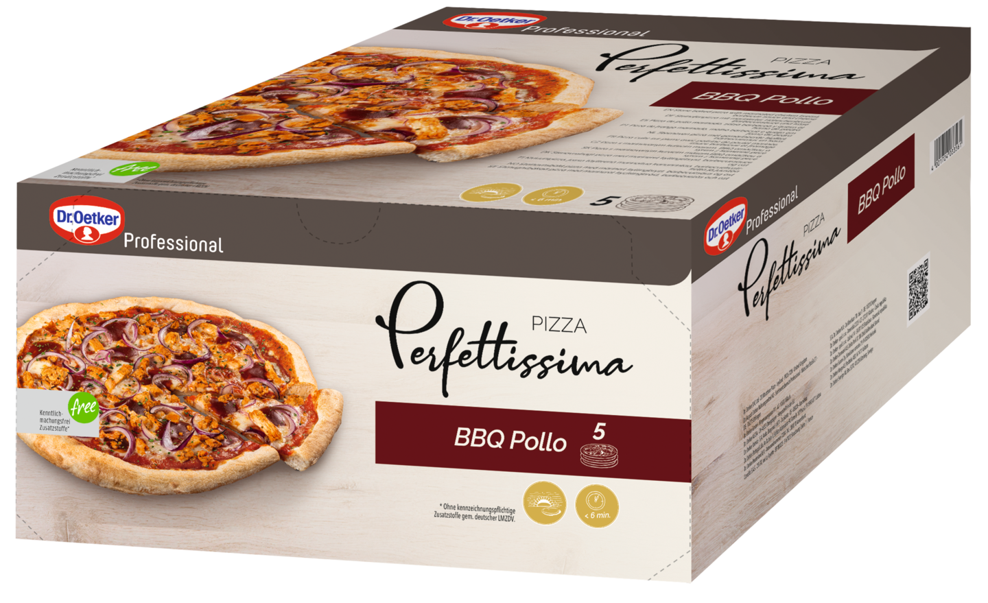 Pizza Perfettissima on kuin aito Italialainen makuelämys, rapealla kiviuunissa esipaistetulla pizzapohjalla. Pizza Perfettissima BBQ Pollo pizzan täytteenä on marinoitua kananrintaa, barbecuekastiketta ja laadukasta mozzarellajuustoa. Rapea pohja ja houkutteleva ulkonäkö tekevät tästä pizzasta täydellisen valinnan asiakkaillesi. Pizzan paistoaika on alle 7 minuuttia.