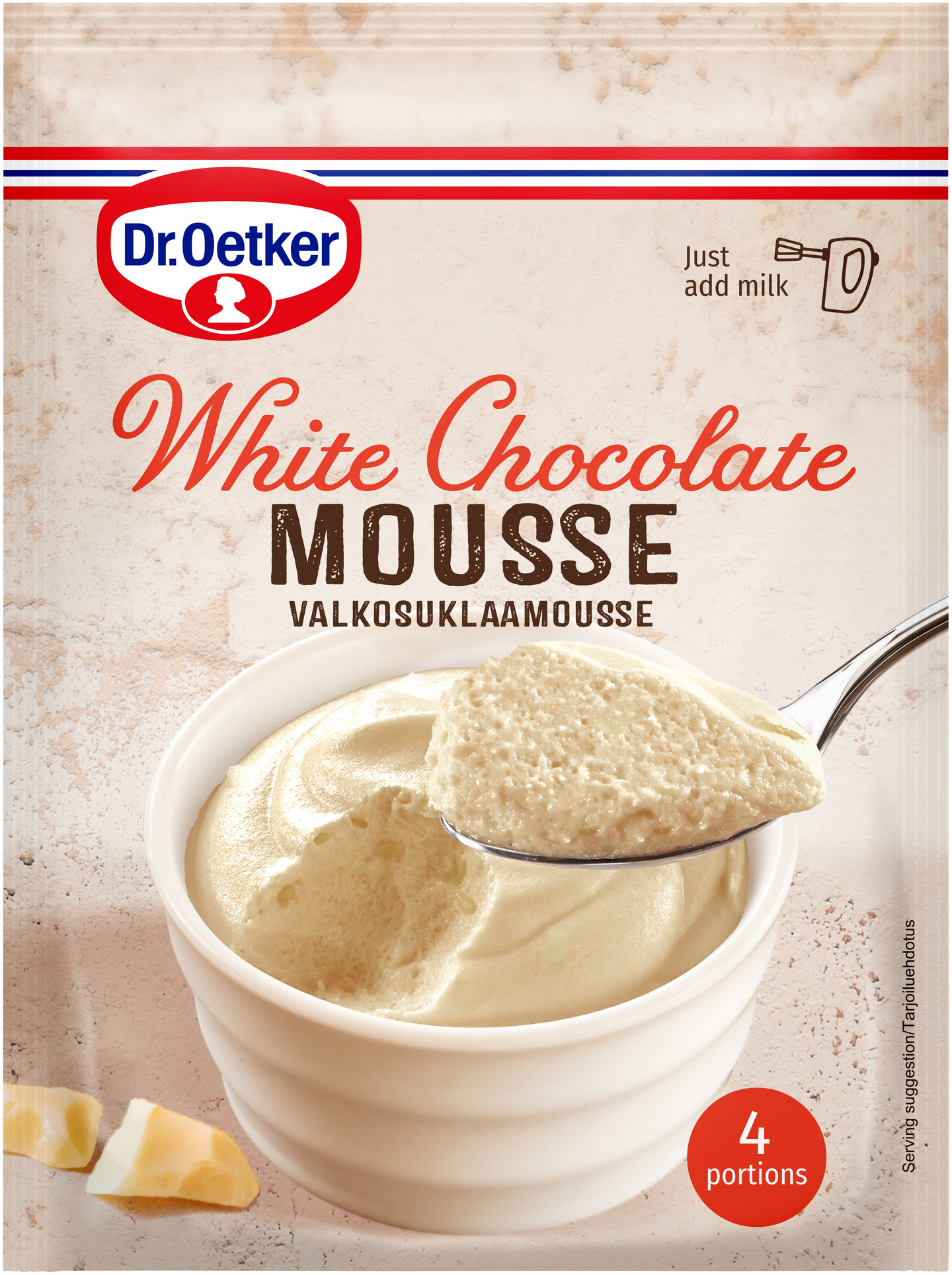 Herkullisen jälkiruoan valmistaminen Dr. Oetker Valkosuklaamoussejauheella on helppoa ja nopeaa. Valkosuklaamoussejauhe sisältää aitoa valkosuklaarouhetta ja siinä on pehmeän valkosuklainen maku. Jauhe vatkataan kylmään kevytmaitoon ja Mousse on tarjottavissa noin tunnissa. Täyteläisemmän lopputuloksen saa korvaamalla osan maidosta kermalla. Juhlavan jälkiruoan saa annostelemalla Moussen valmiiksi tarjoilukulhoihin ja koristelemalla tuorreilla marjoilla, hedelmillä tai suklaakoristeilla. Valkosuklaamoussejauhe on pakattu kätevään 70 g pussiin. Pussillisesta Valkosuklaamouseejauhetta valmistuu 4 annosta.