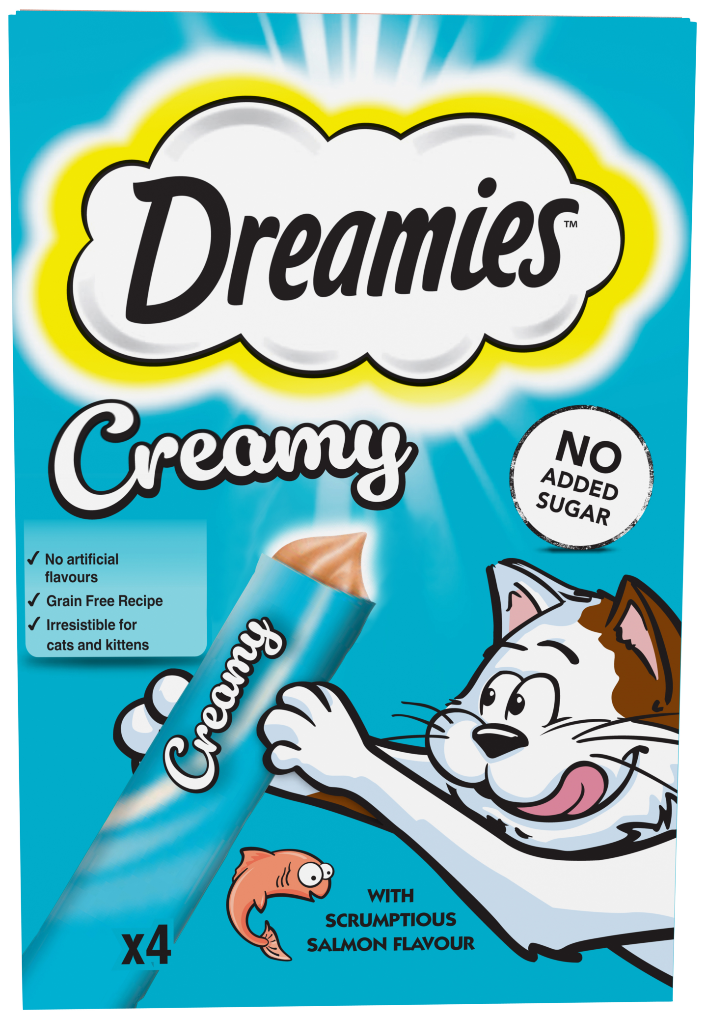 DREAMIES™ Creamy -herkkujen avulla lisäät iloa entisestään! Päästä kissasi sisäinen saalistaja valloilleen ja käsiksi näihin herkullisiin, pehmeisiin makupaloihin.