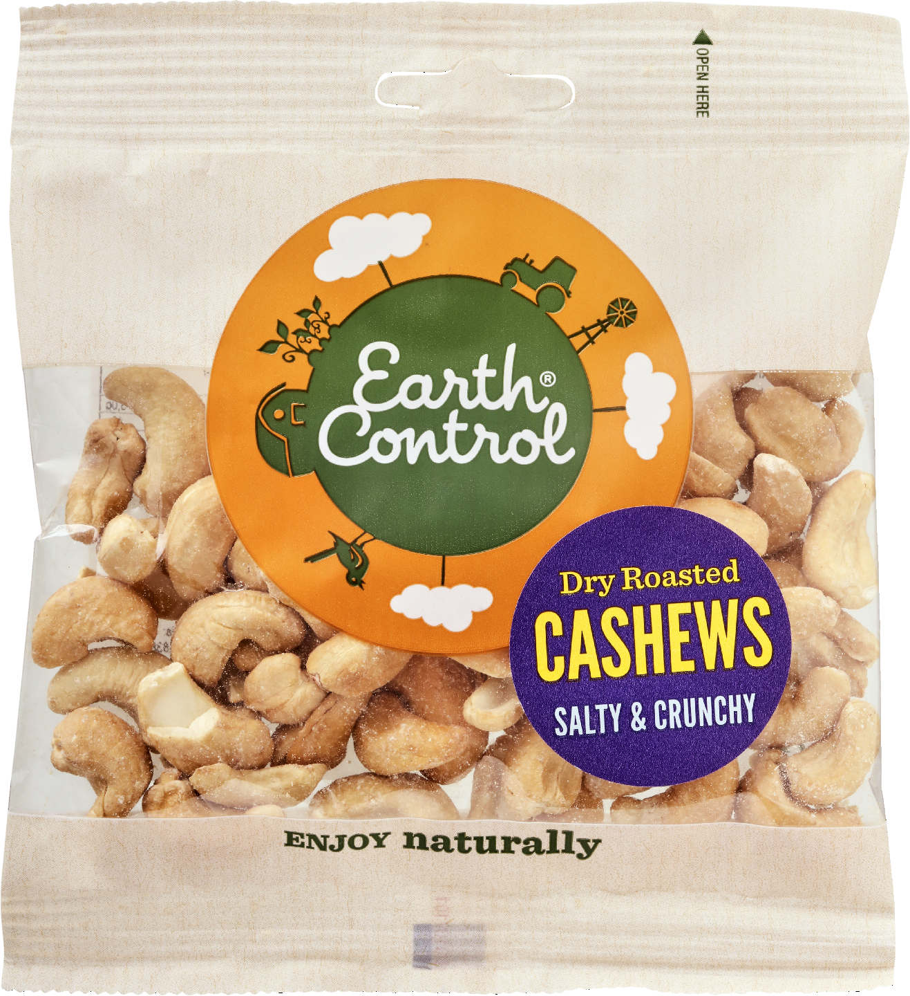 Earth Control Dry -paahdetut cashewpähkinät ovat sekä isojen että pienten suosikkeja miedon, pehmeän ja herkullisen makunsa ansiosta. Ne sopivat hyvin välipalaksi suoraan pussista tai kaikenlaisten herkullisten salaattien täytteeksi.