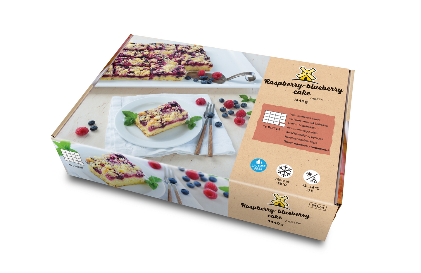 vadelma 23%, kakkuseos (VEHNÄTÄRKKELYS, sokeri, glukoosi (VEHNÄ, maissi), muunnettu perunatärkkelys, emulgointiaineet: E475 (SOIJA), E471 (SOIJA); KANANMUNAJAUHE, nostatusaineet: E450i, E500ii; suola, sakeuttamisaine: ksantaanikumi, elintarvikeväri: beetakaroteeni, aromit), VEHNÄJAUHO, vesi, sokeri, rypsiöljy, KANANMUNAMASSA, mustikka 5,7%, margariini (kasviöljyt (palmu, rypsi), vesi, emulgointiaineet: lesitiini (auringonkukka), rasvahappojen mono- ja diglyseridit (palmu); suola, aromit, happamuudensäätöaineet: E306, E304; säilöntäaine: E202, happo: E330, väri: E160a, fermentoitu VEHNÄJAUHO).