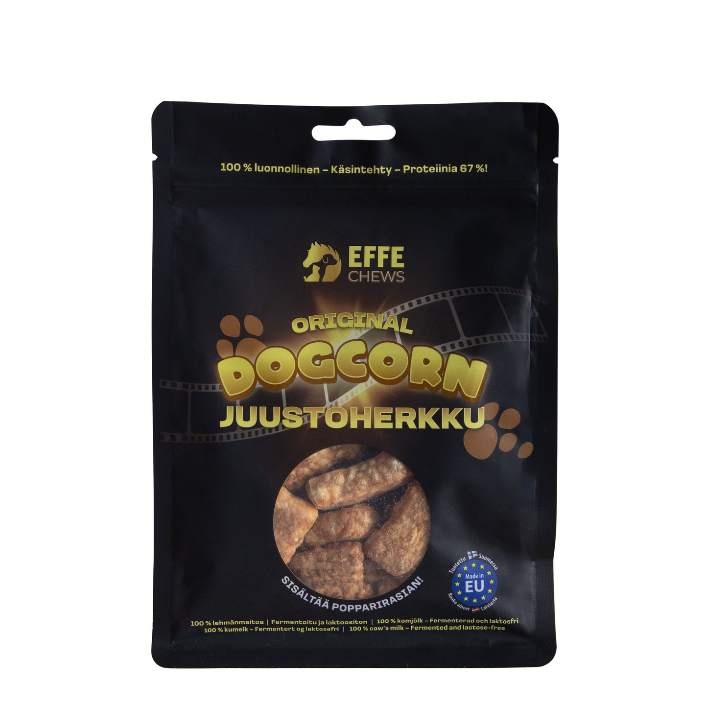 Dogcorn on nimensä mukaisesti koirien oma ”leffaherkku”. Se maistuu erinomaisesti koirille ja on vieläpä terveellinen, luonnollinen sekä käsintehty. Juustoherkku on pehmeämpi ja huokoisempi kuin muut koiranpuruluut, joten se sopii erityisesti pennuille ja vanhemmille koirille.