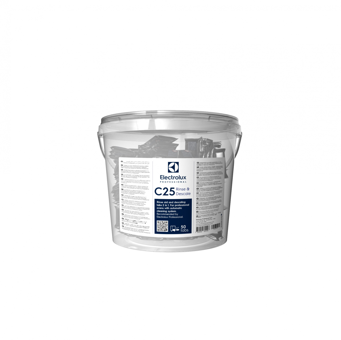 Electrolux Professional C25 huuhteluainetabletit ovat 2 in 1 -ratkaisu, jossa yhdistävät huuhtelu ja kalkkikiven poisto. Tuote on ympäristömyötäinen hajoavien ainesosien ansiosta.