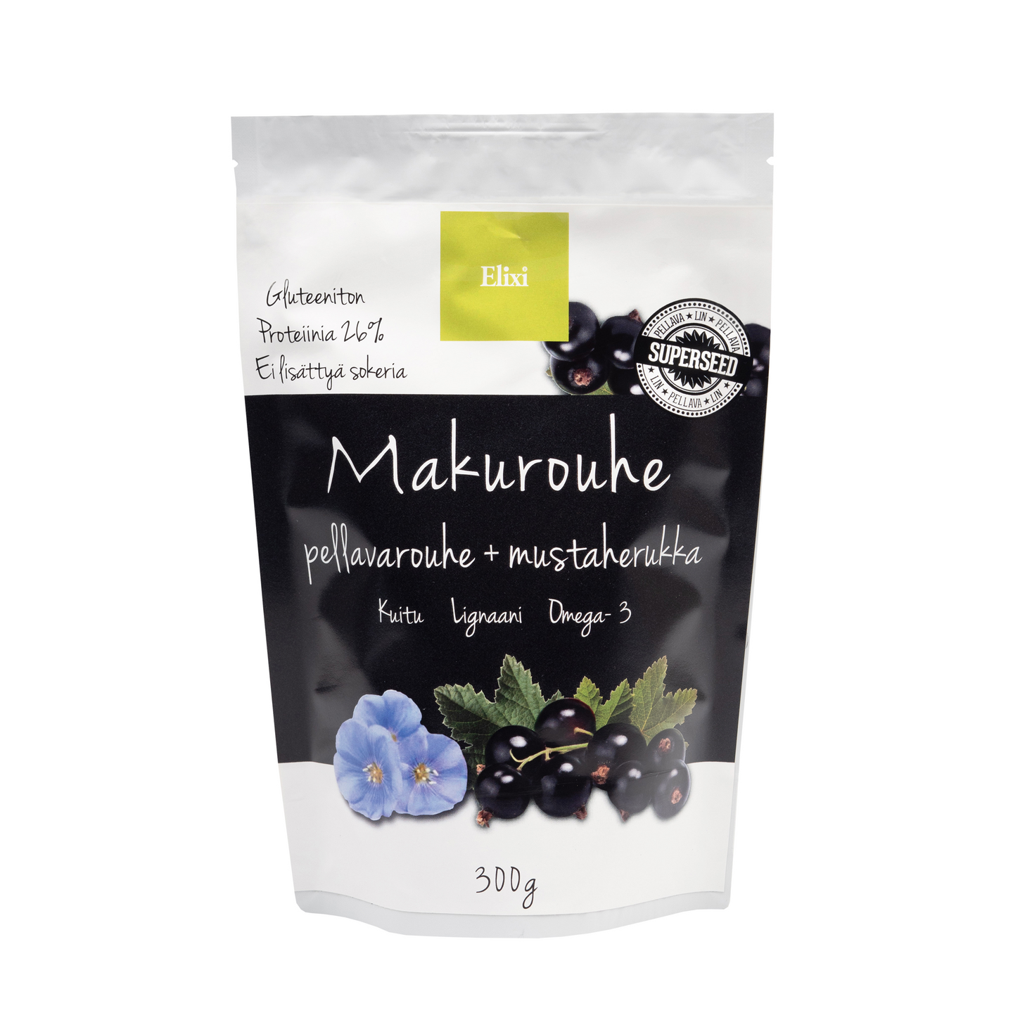 Raikas maku ratkaisee! Elixi Makurouhe Mustaherukka on ravitseva ja maukas sekoitus pellavarouhetta, mustaherukkajauhetta ja mustaherukkarouhetta. Makurouheella voi helposti täydentää päivän kuitu-, rasvahappo- ja proteiinitarvetta.