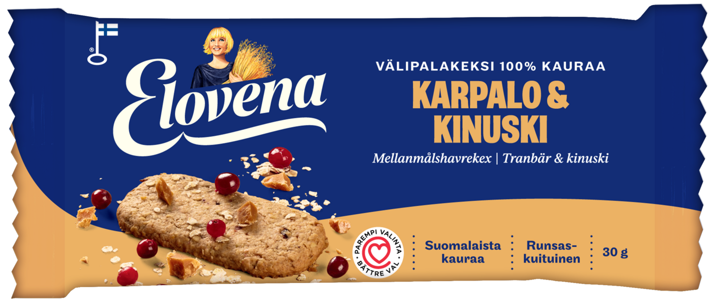 LaktoositonHerkullisessa Elovena Karpalo-Kinuski Välipalakeksissä maistuvat kirpeät karpalot ja makea kinuski. Täysjyväkeksin vilja on 100% kauraa ja se on leivottu rapsiöljyllä. Runsaskuituiselle keksille on myönnetty Suomen Sydänliiton Sydänmerkki. Kätevä, yksittäispakattu keksi on helppo ottaa mukaan ja nauttia aina kun tarvitsee energiaa maistuvassa muodossa. Tuote on valmistettu Suomessa suomalaisesta kaurasta.
