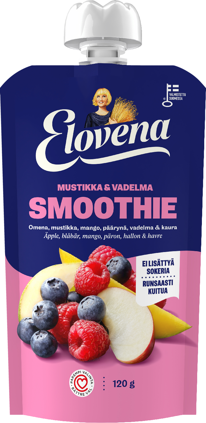 VegaaninenIlonpilkahdus arkeen! Uudet Elovena Smoothiet on valmistettu marjoista, hedelmistä ja kaurasta. Käteviin pusseihin pakatut välipalat on helppo ottaa mukaan koko perheen menoihin ja ne maistuvat taatusti jokaiselle. Mustikka & vadelma Smoothie välipalapussi on luonnollinen ja terveellinen välipala. Marjaisan maistuva smoothie valmistetaan omenasta, mustikasta, mangosta, päärynästä, vadelmasta ja kaurasta. Kätevällä smoothie-välipalalla voit helposti nauttia yhden päivän hedelmäannoksista, missä ikinä liikutkaan.