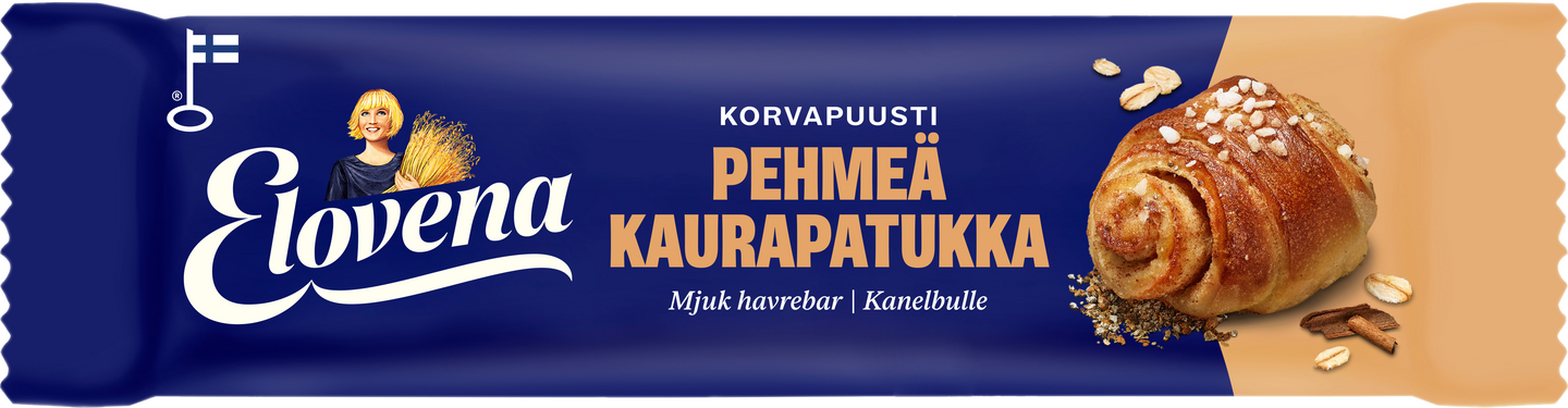 VegaaninenElovena korvapuustinmakuinen pehmeä kaurapatukka on 100% kaurasta leivottu herkullinen välipala, jossa yhdistyy pehmeä rakenne sekä maukkaat ainesosat. Runsaskuituisesta patukasta saat reilusti energiaa. Yksittäispakattuna se on helppo ottaa mukaan menoon ja pehmeän rakenteen ansiosta syöminen sujuu ilman murusia. Kaurapatukalle on myönnetty Suomen Sydänliiton Sydänmerkki. Leivottu Suomessa suomalaisesta kaurasta.
