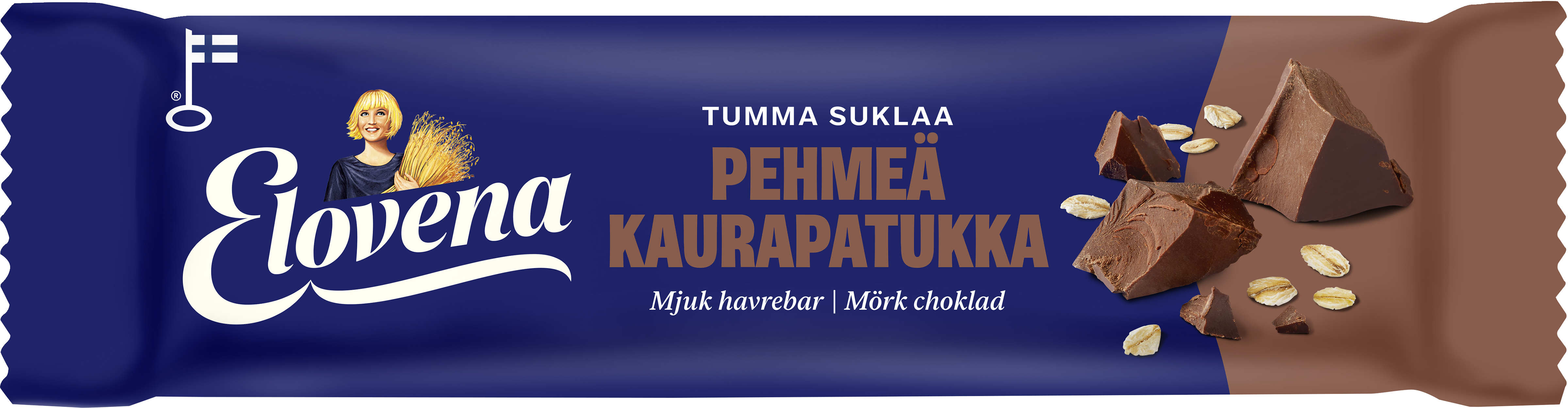 VegaaninenElovena tumma suklaa pehmeä kaurapatukka on 100% kaurasta leivottu herkullinen välipala, jossa yhdistyy pehmeä rakenne sekä maukkaat ainesosat. Runsaskuituisesta patukasta saat reilusti energiaa. Yksittäispakattuna se on helppo ottaa mukaan menoon ja pehmeän rakenteen ansiosta syöminen sujuu ilman murusia. Kaurapatukalle myönnetty Sydänmerkki kertoo, että se on terveellisempi valinta omassa tuoteryhmässään. Leivottu Suomessa suomalaisesta kaurasta.