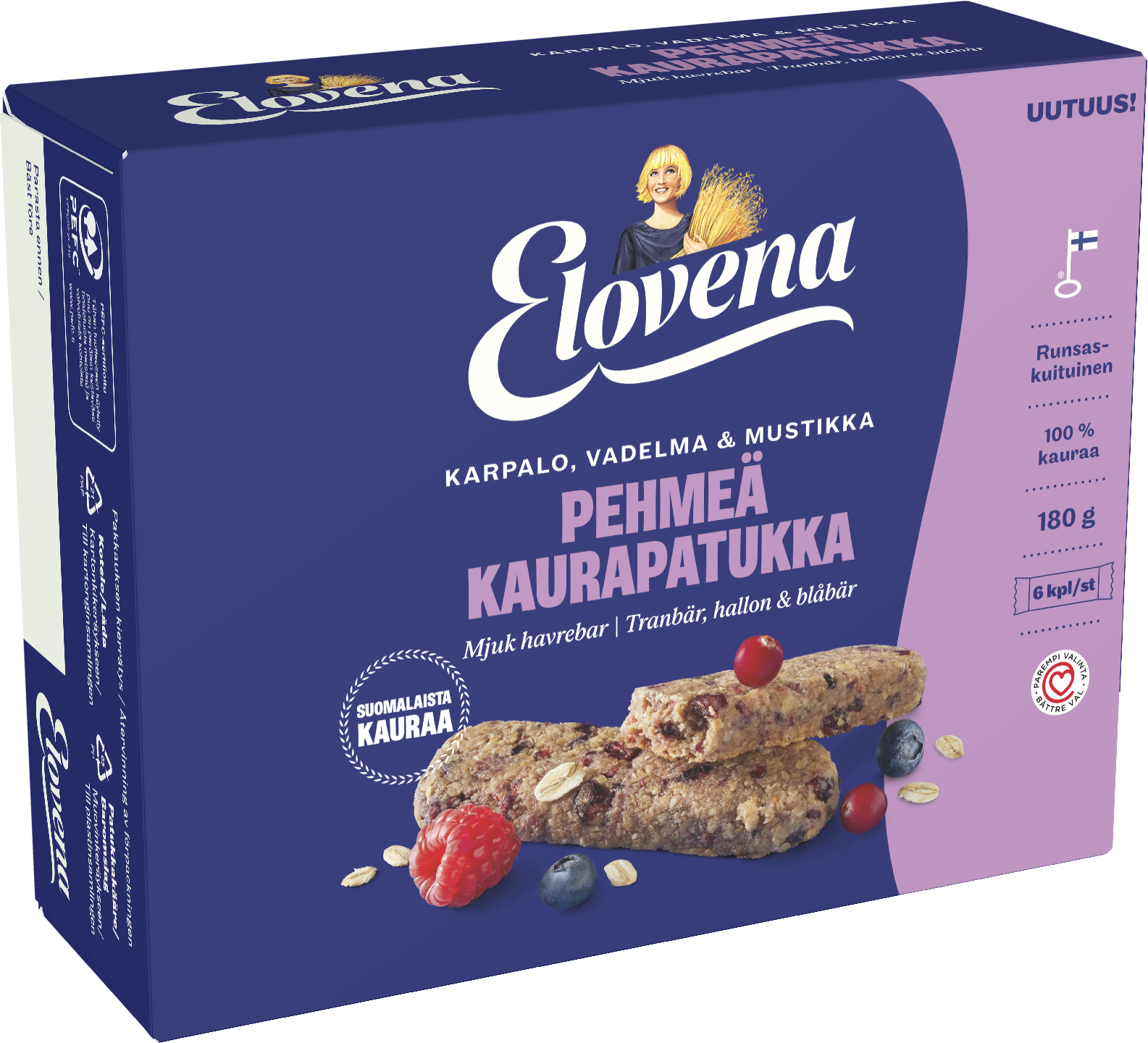 VegaaninenKarpalon, vadelman ja mustikan makuinen pehmeä kaurapatukka on 100% kaurasta leivottu herkullinen välipala, jossa yhdistyy pehmeä rakenne sekä maukkaat ainesosat. Runsaskuituisesta patukasta saat reilusti energiaa. Yksittäispakattuna se on helppo ottaa mukaan menoon ja pehmeän rakenteen ansiosta syöminen sujuu ilman murusia. Kaurapatukalle myönnetty Sydänmerkki kertoo, että se on terveellisempi valinta omassa tuoteryhmässään. Leivottu Suomessa suomalaisesta kaurasta.