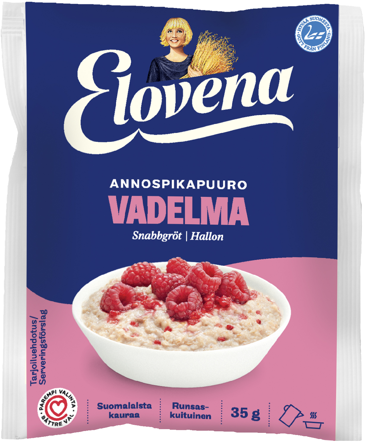 VegaaninenElovena annospikapuuro vadelma on raikkaan marjaisa puurovaihtoehto. Annospussista oma lempipuuro valmistuu kätevästi suoraan lautaselle, tarvitaan vain kiehuvaa vettä. Vatsalle lempeä puuro antaa energiaa päivän ponnistuksiin aamupalana, lounaseväänä, välipalana ja iltapurtavana. Runsaskuituinen tuote on valmistettu Suomessa suomalaisesta kaurasta. Sydänmerkki kertoo, että tuote on terveellisempi valinta omassa tuoteryhmässään.