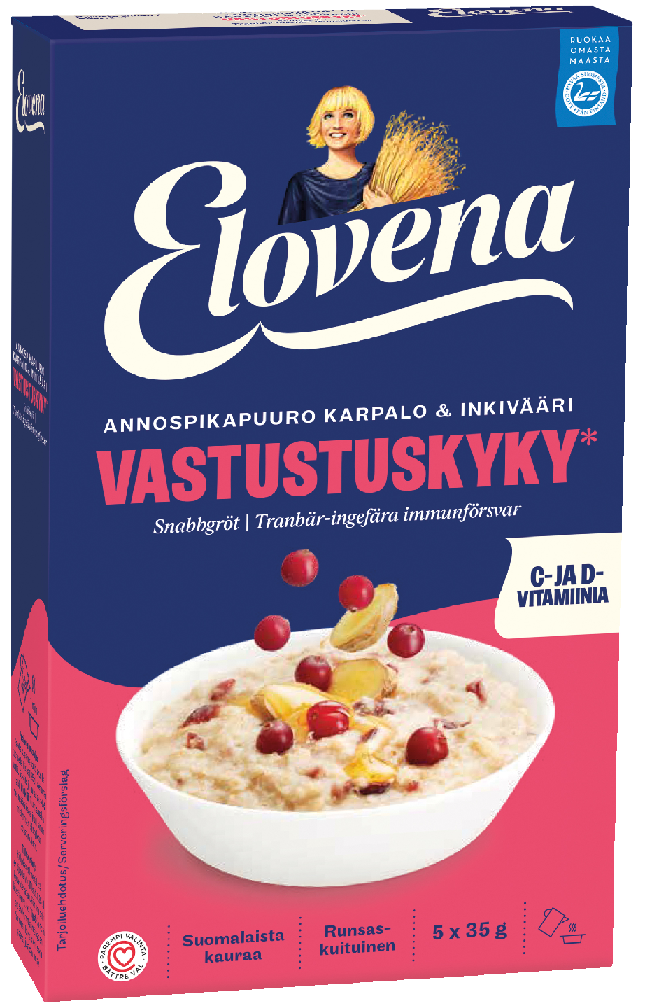RunsaskuituinenElovena annospikapuuro Vastustuskyky auttaa ylläpitämään vastustuskykyä. Herkullisen marjaisa puuro saa makunsa karpaloista ja sitä täydentää inkiväärin tuoma lämpö. Puuroon on lisätty C- ja D-vitamiinia, jotka edistävät immuunijärjestelmän normaalia toimintaa osana monipuolista ruokavaliota ja terveitä elintapoja. Tuote on valmistettu Suomessa suomalaisesta kaurasta. Tuotteelle myönnetty Sydänmerkki kertoo, että se on terveellisempi valinta omassa tuoteryhmässään.