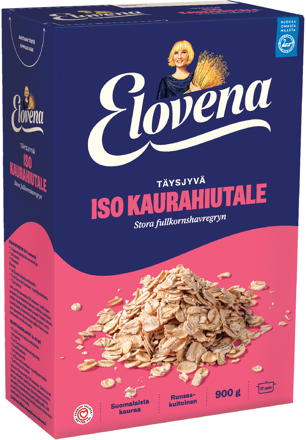 VegaaninenElovena isot kaurahiutaleet valmistetaan kokonaisista kauranjyvistä. Ne sopivat erityisesti niille, jotka toivovat puuroonsa karkeampaa rakennetta. Voit käyttää runsaskuituisia kaurahiutaleita myös leivontaan. Tuote on valmistettu Suomessa suomalaisesta kaurasta.