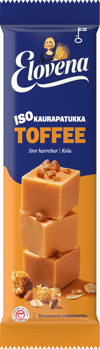 LaktoositonElovena Iso kaurapatukka Toffee on kertakaikkisen kiehtova välipalapatukkauutuus! Rouhean herkku rakenne, suussa sulava kuorrute ja rouskuvat ripotteet yhdessä täyteläisen toffeen kanssa nostavat hymynkareen huulille arkisenakin välipalahetkenä. Kuten täysi elo, niin myös tämä runsaskuituinen patukka on ihan sitä tuttua kauraa.