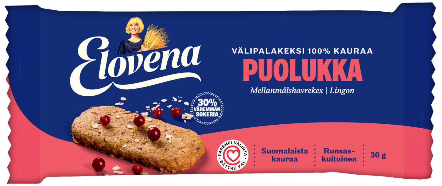 VegaaninenElovena Puolukka täysjyväkeksin vilja on 100% kauraa ja se on leivottu rapsiöljyllä. Runsaskuituinen keksi sisältää 30% vähemmän sokeria kuin välipalakeksit keskimäärin ja sille on myönnetty Sydänmerkki. Kätevä yksittäispakattu keksi on helppo ottaa mukaan ja nauttia aina kun tarvitsee lisää energiaa maistuvassa muodossa. Tuote on valmistettu Suomessa suomalaisesta kaurasta.