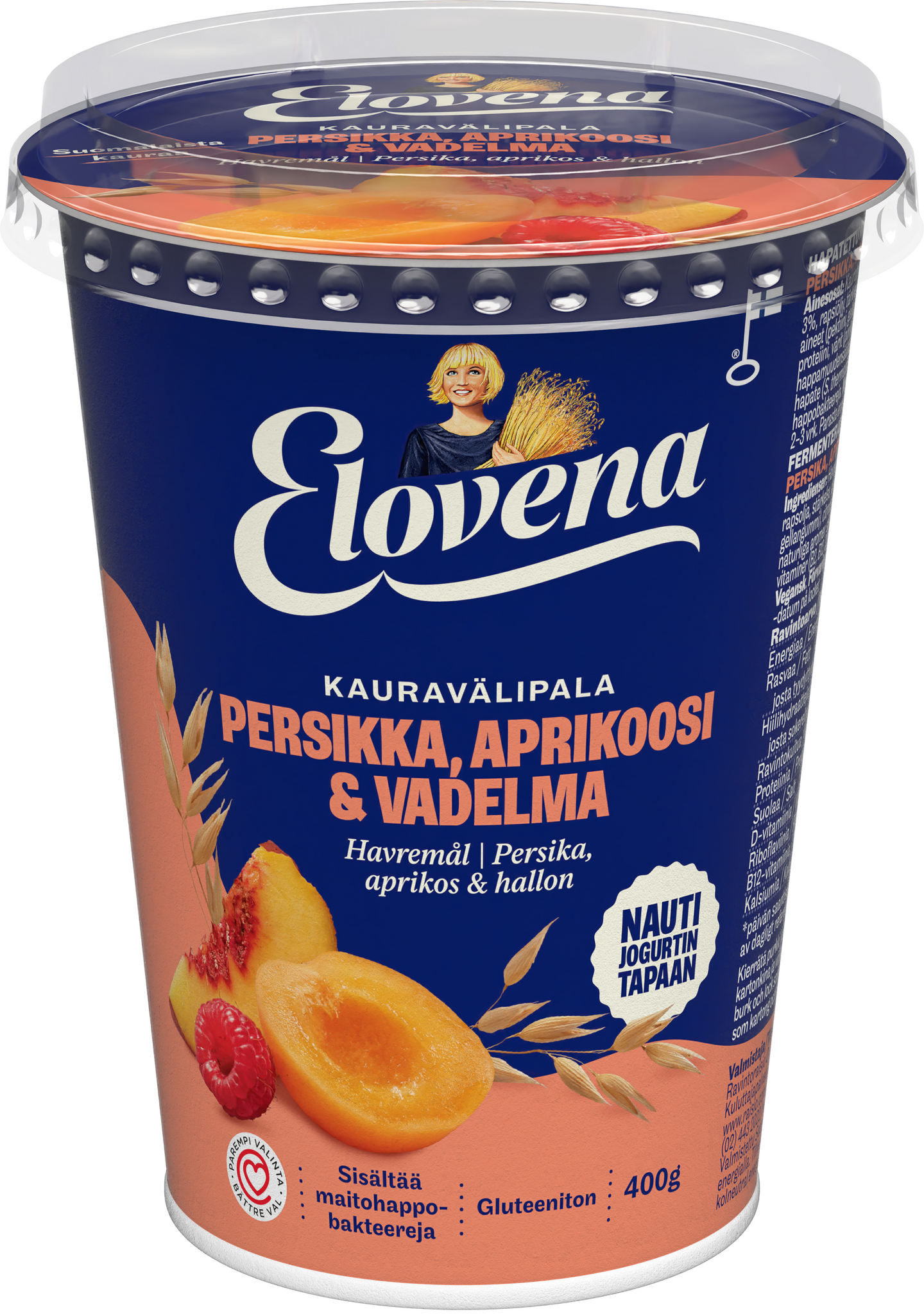 Kaurapohja (vesi, gluteeniton KAURA 10%), sokeri, persikka 3%, rapsiöljy, tärkkelys, aprikoosi 1,5%, vadelma 1,2%, sakeuttamisaineet (pektiini, gellaanikumi), sitruunatäysmehutiiviste, perunaproteiini, värit (porkkana, kurpitsa), luontaiset aromit, suola, kalsium, vitamiinit (B2, B12, D2), hapate (S. thermophilus, L. bulgaricus).