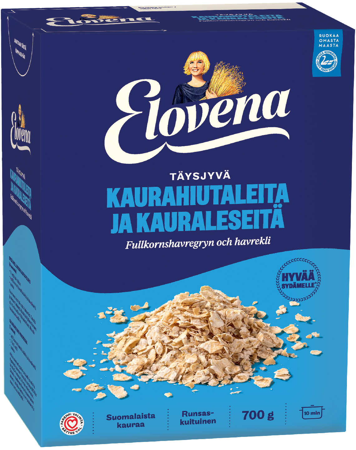 VegaaninenElovena kaurahiutaleista ja kauraleseistä valmistat herkullisen maistuvaa, runsaskuituista puuroa. Tuote sisältää beetaglukaanikuitua, joka auttaa alentamaan kolesterolia. Täysjyväkaurahiutaleet sisältävät myös runsaasti rautaa, magnesiumia ja sinkkiä. Elovena hiutaleista voit valmistaa puuron lisäksi myös maukkaita välipaloja ja jälkiruokia. Tuote on valmistettu Suomessa suomalaisesta kaurasta.
