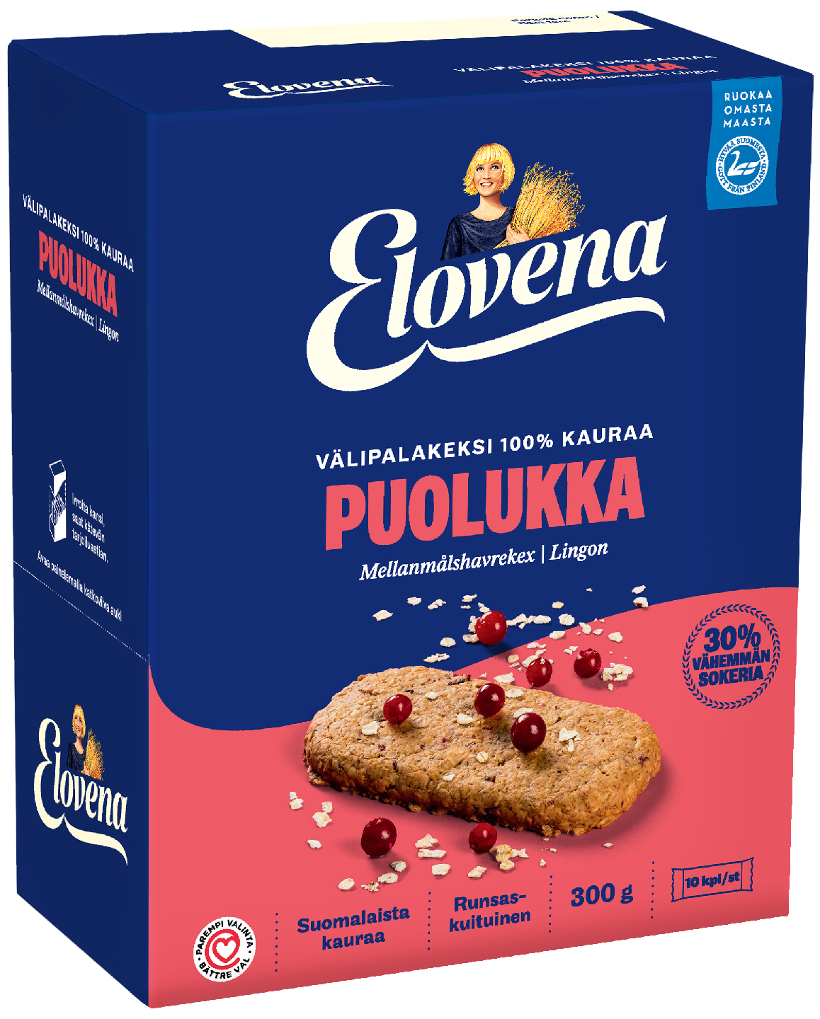 VegaaninenElovena Puolukka täysjyväkeksin vilja on 100% kauraa ja se on leivottu rapsiöljyllä. Runsaskuituinen keksi sisältää 30% vähemmän sokeria kuin välipalakeksit keskimäärin ja sille on myönnetty Sydänmerkki. Kätevä yksittäispakattu keksi on helppo ottaa mukaan ja nauttia aina kun tarvitsee lisää energiaa maistuvassa muodossa. Tuote on valmistettu Suomessa suomalaisesta kaurasta.