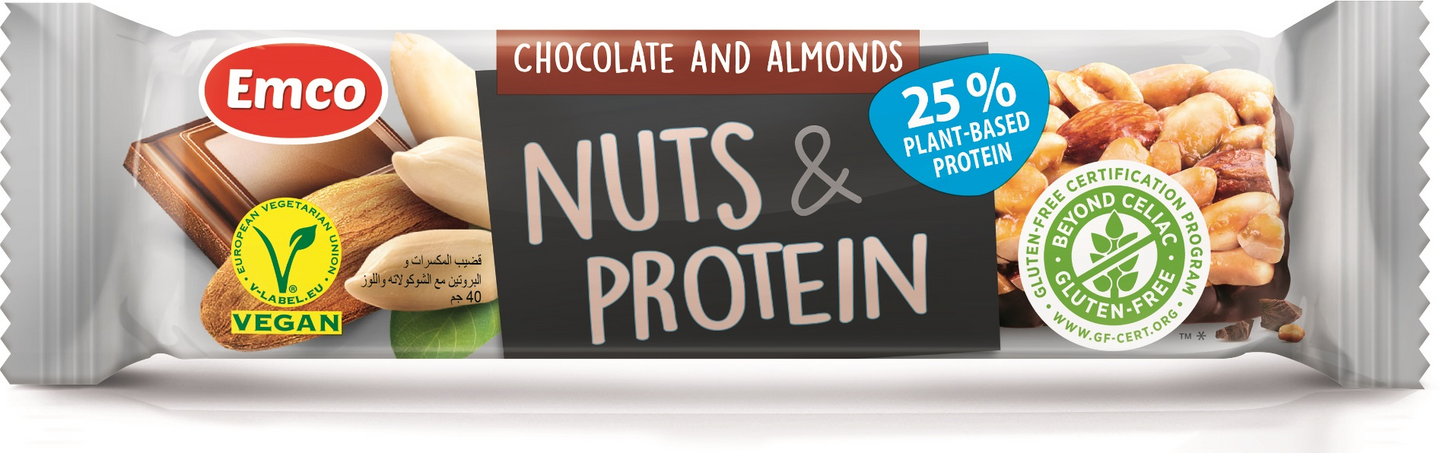 VegaaninenEmco Nuts & Protein Chocolate and Almonds on mm. pähkinöistä, mantelista ja tummasta suklaasta valmistettu runsaasti proteiinia sisältävä patukka. Vegaani ja gluteeniton patukka sopii esim. välipalaksi. Halal ja kosher. Kuidun lähde.