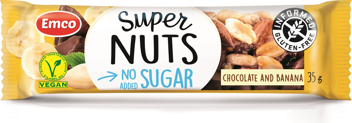VegaaninenEmco Super Nuts Chocolate and Banana on herkullinen pähkinöitä, tumma suklaata ja kuivattua banaania sisältävä välipalapatukka. Patukka on runsaskuituinen, vegaani sekä gluteeniton. Patukassa ei ole lisättyä sokeria (sisältää luontaisesti sokereita). Halal ja kosher.