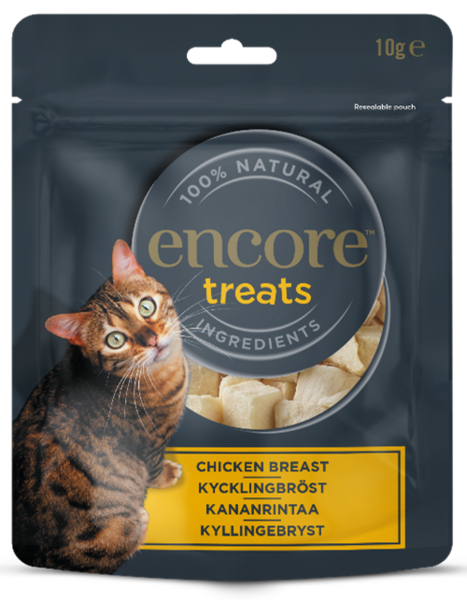 Encore-pakastekuivatut kananrintaherkut ovat juuri sitä – 100 % kananrintaa, 100 % luonnollisia eikä mitään muuta. Encore-pakastekuivatut kananrintaherkut ovat luonnollinen lisäherkku tai täydennys aikuisille kissoille.