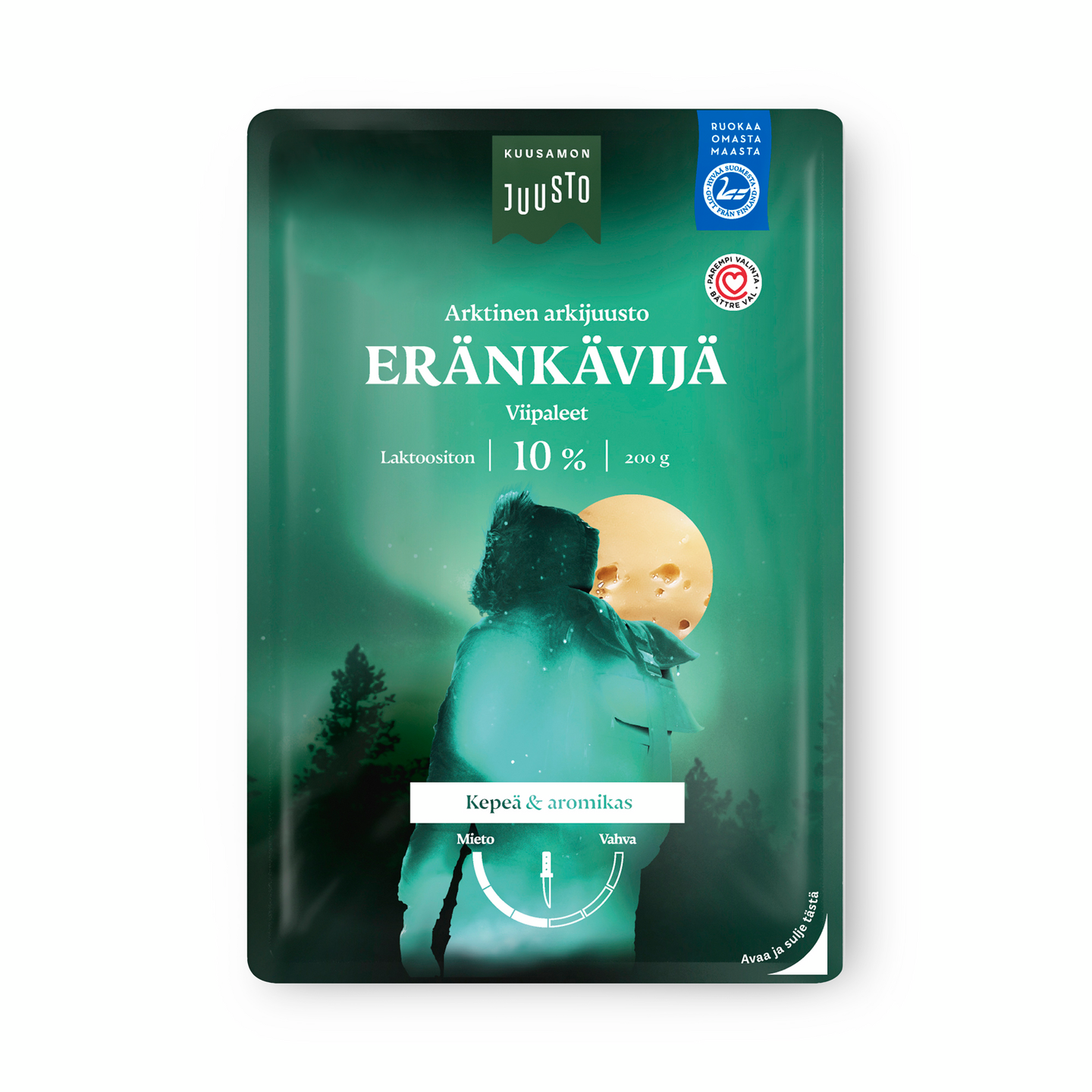 LaktoositonEränkävijä® 10% on kepeä ja aromikas arktinen arkijuusto, jonka mausta ei ole tingitty pienestä rasvaprosentista huolimatta. Sydänmerkki-tuote on parempi valinta. Kuusamon Juuston Eränkävijä® 10% on laktoositon juusto, joka sisältää runsaasti kalsiumia.