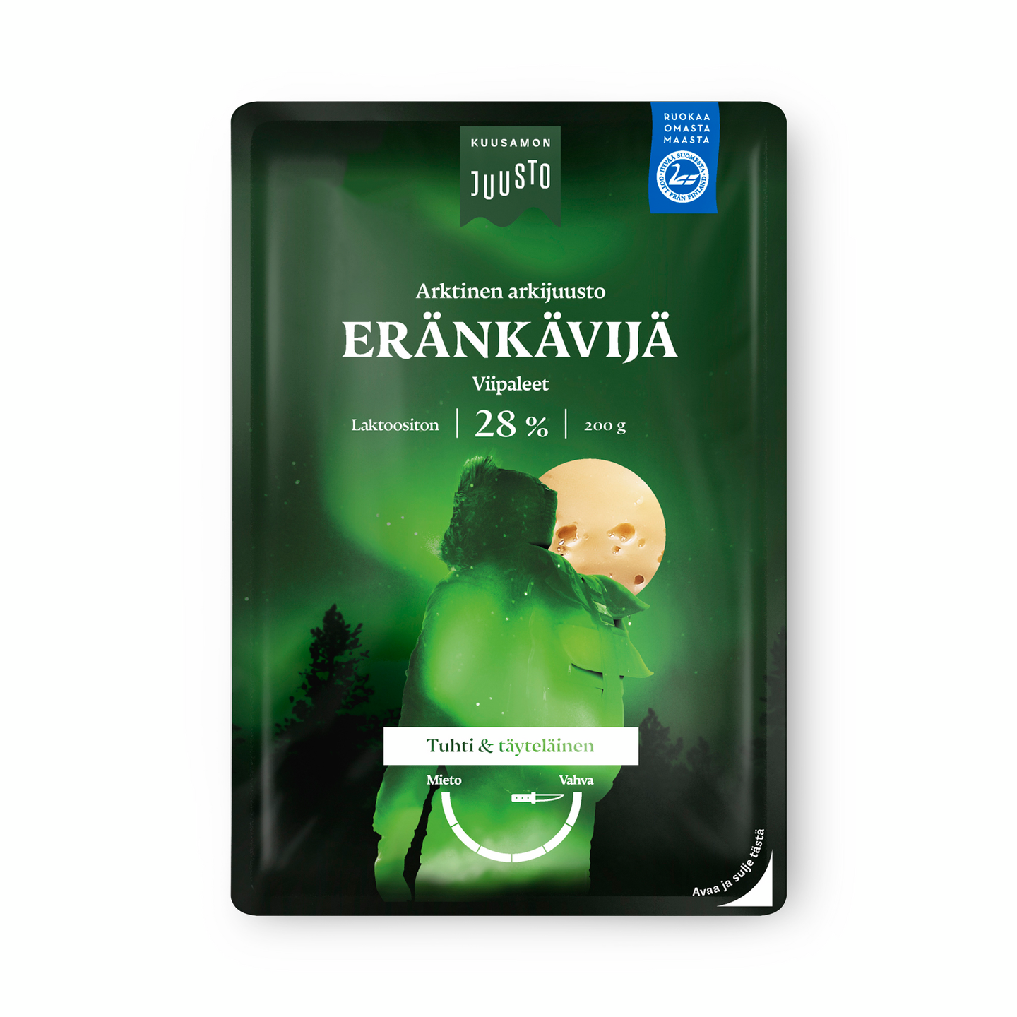 Eränkävijä® 28% on tuhti ja täyteläinen, vaativampaankin makuun sopiva juusto. Maultaan täyteläinen juusto helppoina viipaleina. Kuusamon Juuston Eränkävijä® 28% on laktoositon juusto.