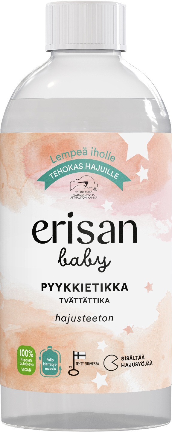 Kotimainen ja hajusteeton Erisan Baby Pyykkietikka pyykin on raikaste, jota käytetään huuhteluaineen tapaan. Se raikastaa ja pehmentää vauvan- ja lastenpyykin luonnollisesti, ilman hajusteita, väri- ja säilöntäaineita. Kierrätysmuovipulloon pakattu, Allergiatunnuksellinen Erisan Baby Pyykkietikka on 100% nopeasti biohajoava ja kasvipohjaisista raaka-aineista. Se poistaa sähköisyyttä ja kirkastaa tekstiilien värit. Lisäksi se sisältää hajunsyöjää, joka neutralisoi ja raikastaa pinttyneet ja epämiellyttävimmätkin hajut. Sopii myös villalle, luonnonsilkille, kestovaipoille ja elastaania sisältäville tekstiileille.