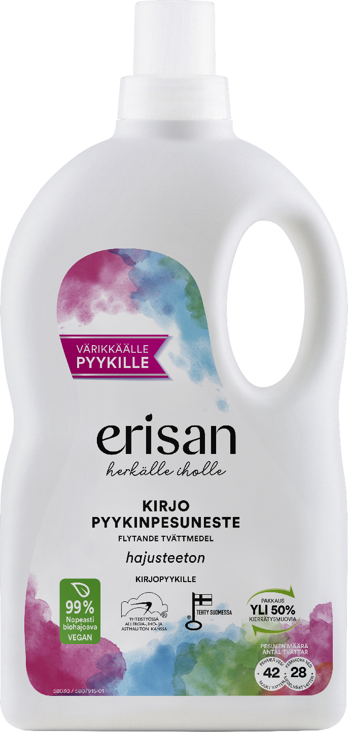 Erisan Kirjo Pyykinpesuneste pitää värikkäät tekstiilit kirkkaina hellävaraisesti ja puhdistaa tehokkaasti hankaliakin tahroja, kuten tärkkelys-, marja- sekä hedelmätahrat. Nukkaantumisenesto-ominaisuus auttaa pitämään tekstiilit hyväkuntoisina. Pyykinpesuneste sisältää myös harmaantumisestoaineen ja huuhtoutuu hyvin tekstiileistä. Tuotteen koostumus on 99% nopeasti biohajoava ja tuote ei sisällä hajusteita, väriaineita, fosfaattia, zeoliittia eikä fosfonaattia. Valmistamme Erisan-pyykinpesuaineet Turussa.