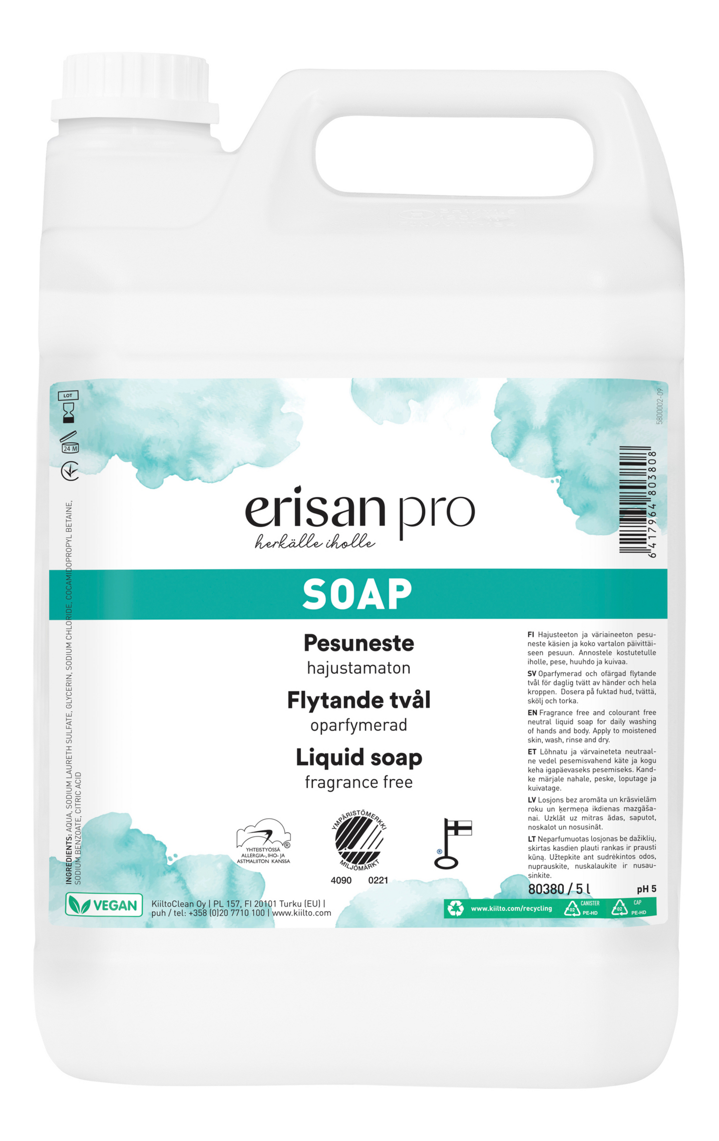 Tehokas mutta samalla hellävarainen, helposti huuhtoutuva pesuneste. Soveltuu usein toistuvaan käsien pesuun. Sisältää glyserolia ihon kuivumisen ehkäisemiseksi. Tuote vaahtoaa miellyttävästi ja huuhtoutuu helposti. Riittoisa. Hajustamaton. pH 5.5. Ammattikäyttöön.