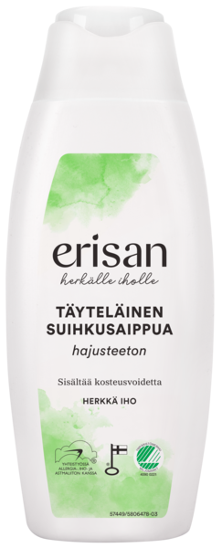 Erisan Täyteläinen Suihkusaippua puhdistaa koko perheen herkän ihon hellävaraisesti. 33 % kosteusvoidetta sisältävä, pehmeästi vaahtoava koostumus tekee ihosta samettisen pehmeän ja joustavan. Sopii usein toistuvaan pesuun. Tuote on kehitetty yhteistyössä Allergia-, Iho- ja Astmaliiton kanssa eikä se sisällä hajusteita, väriaineita eikä parabeeneja. Tuote valmistetaan Suomessa.