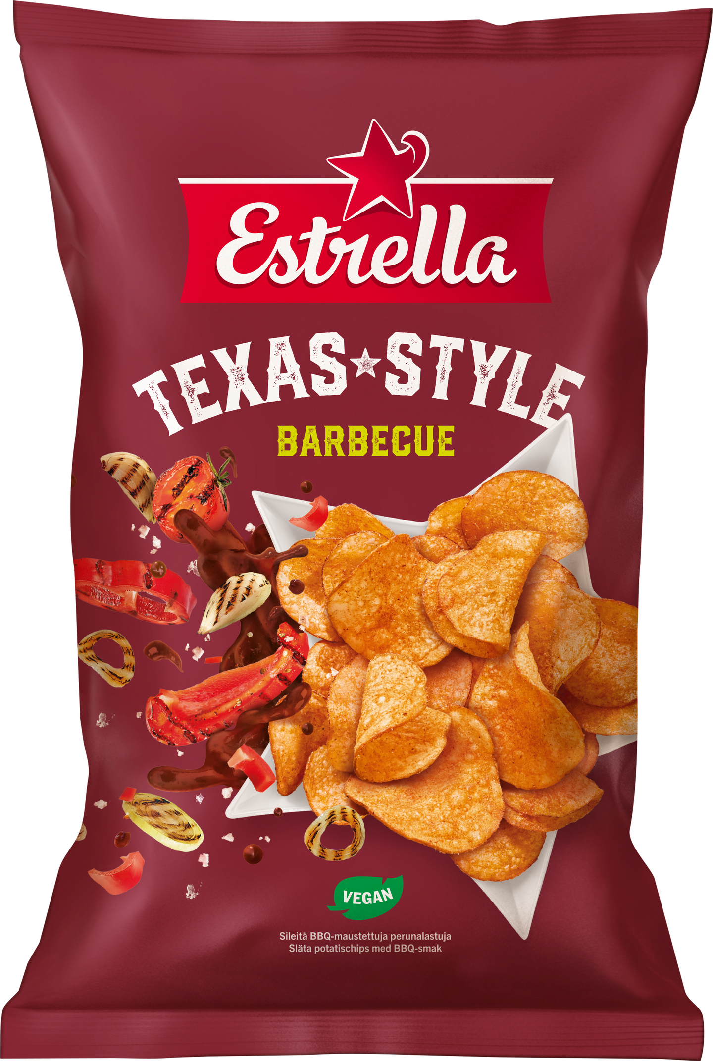 Texas Style Barbecuessa on maku kohdillaan, aivan kuten todelliseen Texasin tyyliin kuuluukin! Nämä sileät, BBQ-maustetut sipsit saavatkin sinut huutamaan “Yeeehaa!” heti ensipuraisusta.