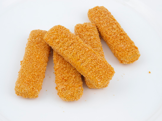 Leivitettyjä ja esipaistettuja kalapuikkoja.