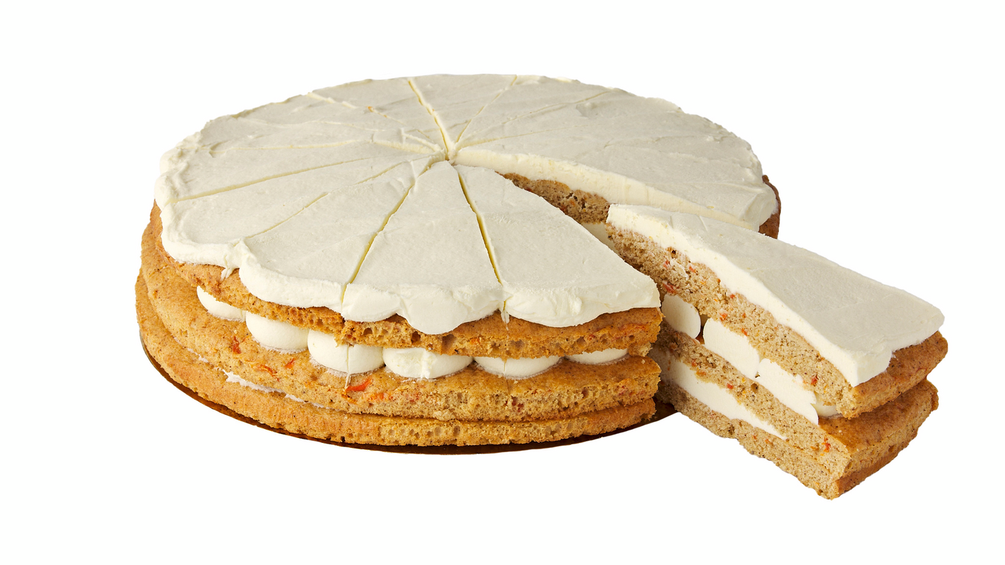 Klassinen porkkanakakku, joka on tehty useampaan kerrokseen näyttävän näköiseksi. Koostumukseltaan mehevä ja maukas. Leikattu valmiiksi 2 x 14 palaan.