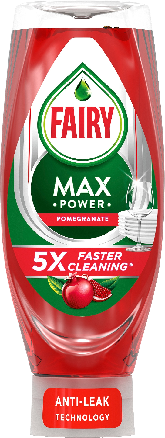 Fairy MaxPower Pomegranate -astianpesuaine on pakattu kätevään, ylösalaisin säilytettävään pulloon ilman kääntökorkkia, mikä tekee tiskaamisesta nopeampaa ja helpompaa.