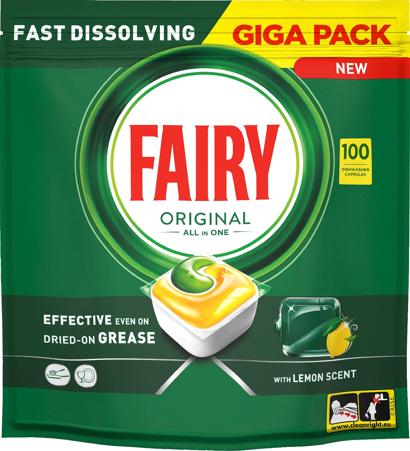 Fairy Original All in One -konetiskitabletit puhdistavat ensimmäisellä pesukerralla ja poistavat tehokkaasti myös kuivuneen rasvan tehden astioista hohtavan puhtaita. Fairy yhdistää nesteen ja jauheen yhdeksi tehokkaaksi kapseliksi. Ultraliukoinen pussi liukenee nopeasti, joten se alkaa puhdistaa nopeasti ja tekee valmista. Ja ne ovat todella helppokäyttöisiä! Tablettia ei tarvitse avata, laitat sen vain astianpesukoneen pesuainelokeroon.
