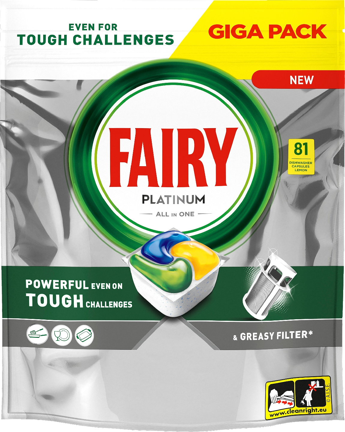 Fairy Platinum All in One -konetiskitabletit puhdistavat ensimmäisellä pesukerralla ja läpäisevät haastavimmankin lian tehden astioista hohtavan puhtaita. Fairy Platinumin puhdistusteho antaa itseluottamusta monipuoliseen ruoanlaittoon. Se puhdistaa myös rasvaisen suodattimen jättäen astiasi ja astianpesukoneesi raikkaan puhtaiksi. Fairy yhdistää nesteen ja jauheen yhdeksi tehokkaaksi kapseliksi. Ultraliukoinen pussi liukenee nopeasti, joten se alkaa puhdistaa nopeasti ja tekee valmista. Ja ne ovat todella helppokäyttöisiä! Tablettia ei tarvitse avata, laitat sen vain astianpesukoneen pesuainelokeroon.