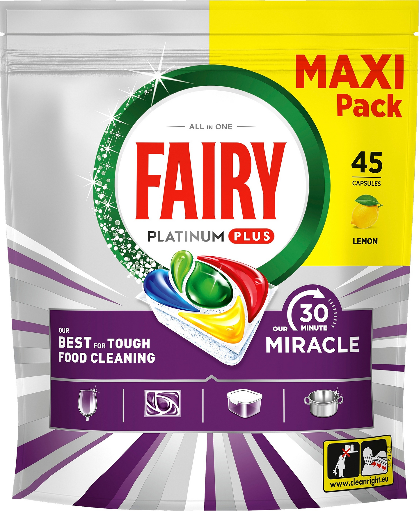 MIRACLE ALL-IN-ONE -RATKAISU, JOKA TEKEE ASTIOISTA HOHTAVAN PUHTAITA. Tutustu Fairyn 30 Minute Miracle Platinum Plus -astianpesutabletteihin, jotka ovat Fairyn paras ratkaisu pinttyneen lian puhdistamiseen. Nämä Miracle All-in-One -astianpesutabletit saavuttavat moitteettoman lopputuloksen vaivattomasti lyhyimmissäkin pesuohjelmissa ja jättävät jälkeensä kevyen sitruunan tuoksun. Viisi geelin tehoa takaa säihkyvän puhtaat astiat, erinomaisen kiillon, nopean kuivumisen, rasvasuodattimen puhdistuksen ja Anti-dull-teknologian. Sisältää 3 kertaa enemmän rasvaa poistavia ainesosia kuin Fairy Original All-in-One, joten se poistaa pinttyneet ruokatahrat jo 30 minuutissa. Fairy selviää sekä pitkistä että lyhyistä pesuohjelmista. Se puhdistaa ensimmäisellä pesukerralla, eikä esi- tai uudelleenpesua tarvita. Aivan kuten nestemäinen Fairy-astianpesuaine, mutta kätevässä tablettimuodossa. Näiden astianpesutablettien ansiosta astianpesukonesuolaa tai huuhtelukirkastetta ei tarvitse käyttää. Ne sopivat täydellisesti kiireisille kotitalouksille, sillä ne puhdistavat nopeasti ja erinomaisesti aivan kuin astiat olisivat lionneet yön yli. Koe Miraclen teho ja tervehdi säihkyviä tuloksia Fairyn 5 puhdistustehon ansiosta.