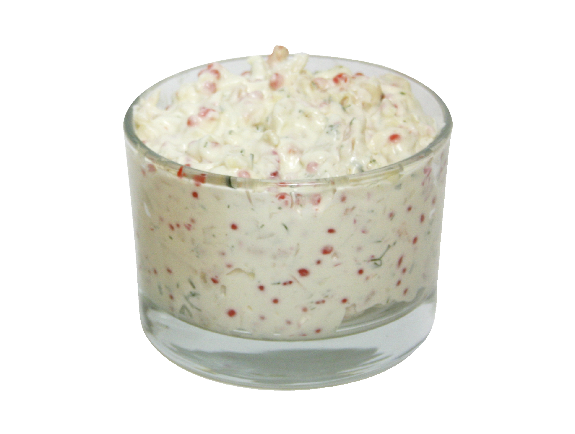majoneesi [[rypsiöljy, vesi KANANMUNA, SINAPPI [vesi SINAPINSIEMEN, glukoosi-fruktoosisiirappi, suola, sokeri, inkivääri, suola, aromit (mustapippuri, chili)], sokeri, suola, sakeuttamisaineet (E415, E412), happamuudensäätöaineet (E260, E330), säilöntäaineet (E211, E202)]], KATKARAPU 29,5% ]Msc-sertifioitu KATKARAPU/Pandalus borealis, pyydetty troolilla, Koillis-Atlantti/vesi, suola], SURIMI 20%[[KALANLIHA, stabilointiaineet: sorbitoli (E450, E451, E452), sokeri, vesi, KANANMUNA, tärkkelys (VEHNÄ), rypsiöljy, aromivahvenne (ÄYRIÄINEN, E635), suola, sokeri, stabilointiaine (E407), väriaineet (E120, E160c)], merilevävalmiste [merileväuute, vesi, suola, mausteet, väriaine (E172)], vesi, etikka, tilli, sokeri, muunnettu maissitärkkelys (E1442), suola, sitruunatäysmehu (sisältää SULFIITTIA) happamuudensäätöaine (E330), sipuli, säilöntäaineet (E211, E202), valkopippuri