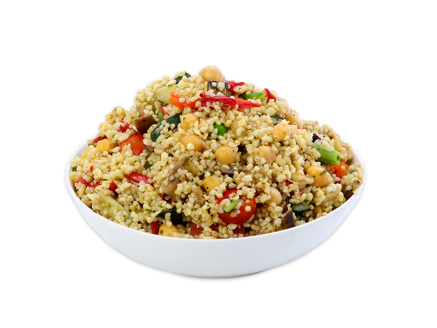 Bulgur (vesi, BULGURVEHNÄ), kvinoa esikeitetty (kvinoa, vesi), grillattu kesäkurpitsa, kikherne (kikherne, vesi, suola, hapettumisenestoaine E330), kirsikkatomaatti, grillattu punainen paprika, esipaistettu munakoiso (munakoiso, auringonkukkaöljy), palkoherne, rypsiöljy, KORIANTERI, suola.