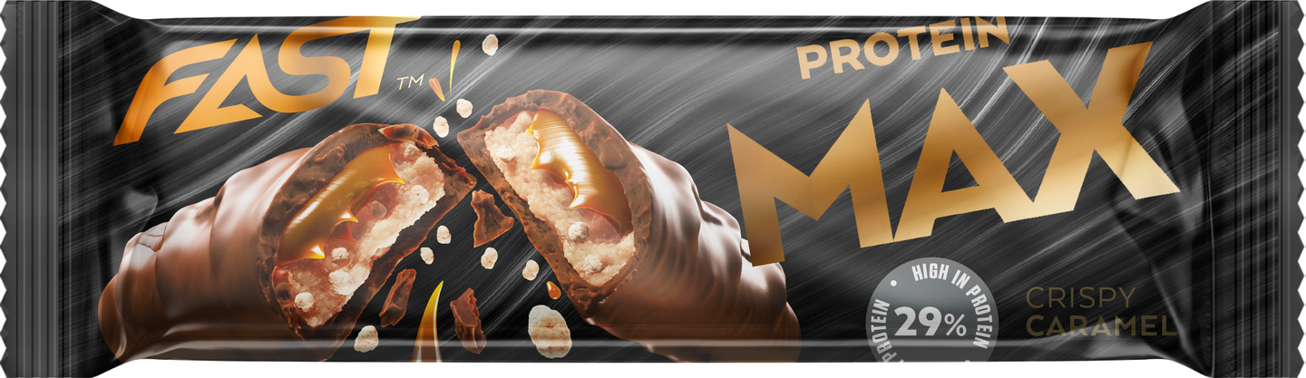 FAST MAX Crispy toffee tarjoaa nimensä mukaisesti toffeisen makuelämyksen kera proteiinin. Se on makeutettu sokerilla, eikä sisällä keinotekoisia makeutusaineita. FAST MAX Crispy toffee sopii niin herkutteluun kuin välipalaksi! Se valmistetaan gluteenivapaissa tuotantotiloissa ja soveltuu siksi myös keliaakikoille.