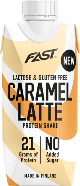 LaktoositonLaktoositon ja gluteeniton FAST Protein Shake Caramel Latte on täyteläinen karamellin ja maitokahvin makuinen proteiinijuoma. Se sisältää 21 g ravitsevaa proteiinia eikä lainkaan lisättyä sokeria. Nauti shake herkullisena välipalana tai tue palautumistasi treenin jälkeen. Valmistettu Suomessa.