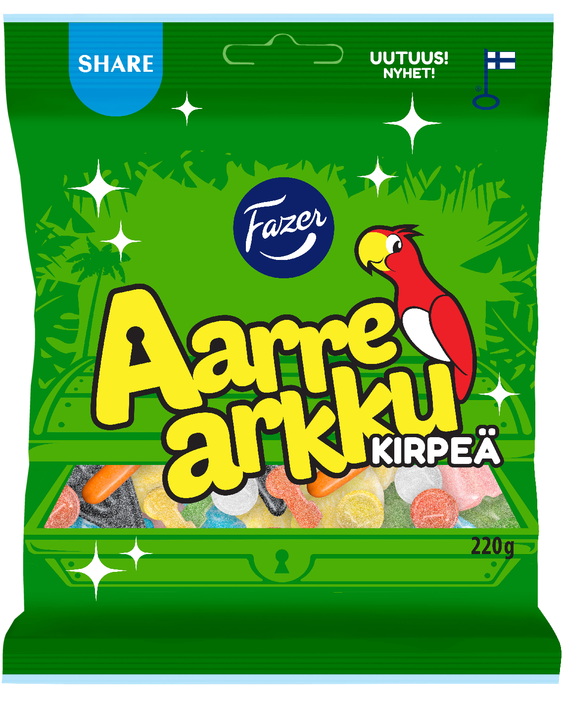 Koko perheen suosikkipussi Aarrearkku saa rinnalleen uudenlaisen karkkikätkön – Aarrearkku Kirpeän. Kirpeä karkkipussi on sekoitus hedelmäkarkkeja, suolaista salmiakkia ja lakurakeita. Löydä tutut Amazon-eläimet, avaimet, lantit ja salmiakkiset merirosvoruudut herkullisen kirpeinä versioina! Keskikokoisesta karkkipussista riittää kirpeitä aarteita jaettavaksi useammallekin aarteenmetsästäjälle!
