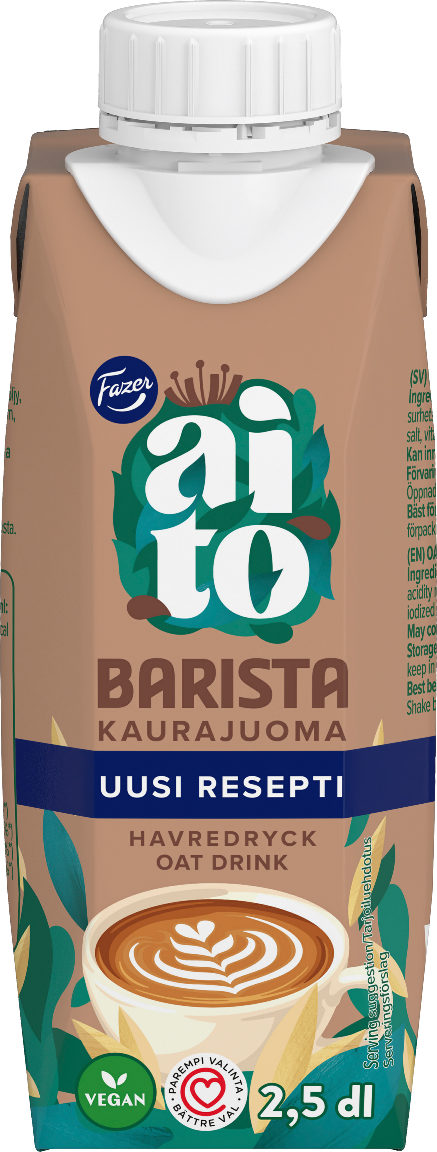 VegaaninenUudella reseptillä tehty, vähemmän makea, Fazer Aito Kaurajuoma Barista tuo ihanan kahvielämyksen jokaiseen kotiin ja juhlistaa arkisintakin kahvihetkeä. Halutessasi voit vaahdottaa kaurajuoman täydelliseksi vaahdoksi kahvin päälle. Fazer Aito Kaurajuoma Barista sopii hyvin myös leivontaan ja ruuanlaittoon, kuten sämpylätaikinan pohjaksi tai riisipuuron keittoon. UHT-käsitelty, säilyy avaamattomana huoneenlämmössä. Vegaaninen.