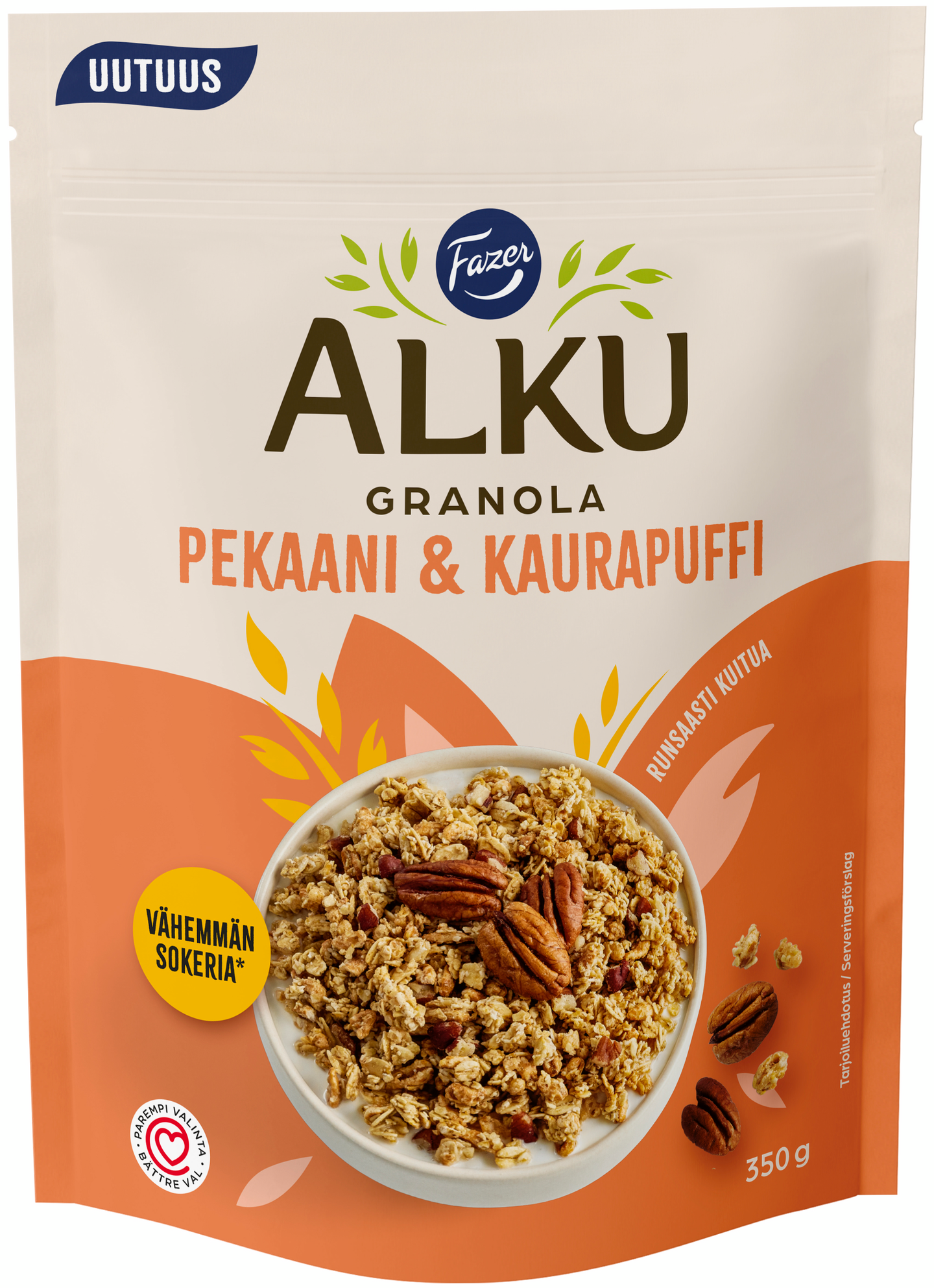 VegaaninenFazer Alku Pekaani & kaurapuffi granola on herkullinen sekoitus paahdettua kauragranolaa, rapeita kaurapuffeja ja maukkaita pekaanipähkinöitä. Täysjyväkaurasta valmistetussa granolassa on vähemmän sokeria ja runsaasti kuitua – ja sille on myönnetty Sydänmerkki. Kokeile myös kreikkalaisen jogurtin tai kasvipohjaisen gurtin kanssa maukkaaksi aamu- tai välipalaksi. Alku hyviin hetkiin!