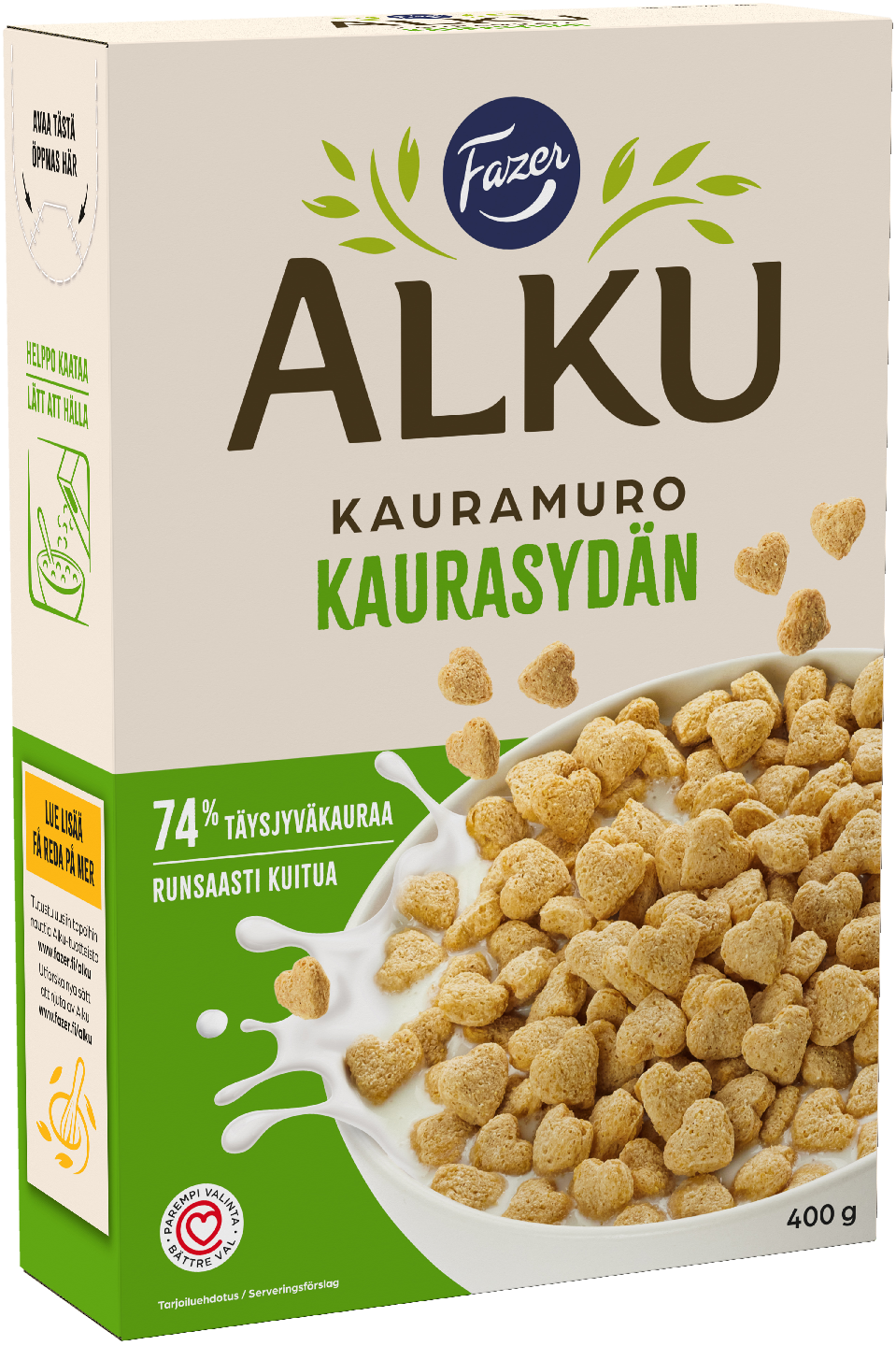 VegaaninenRouskuva Kaurasydän kauramuro saa makunsa herkullisesta täysjyväkaurasta ja raikkaasta omenamehusta. Tämä muro sisältää runsaasti kuitua ja täysjyvää ja sille on myönnetty Sydänmerkki. Herkulliset Alku-murot sopivat raikkaan kaurajuoman tai gurtin kanssa nautittaviksi – tai vaikka naposteltaviksi sellaisenaan. Pakkaus kierrätetään kartonkikeräykseen. Alku hyviin hetkiin!