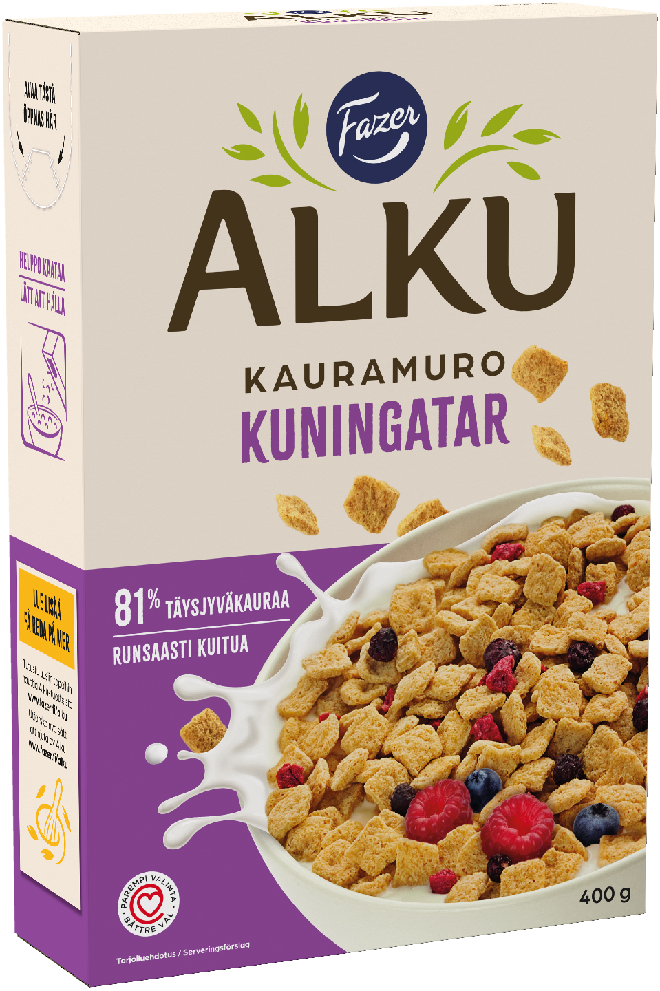 VegaaninenRouskuvat Kuningatar kauramurot saavat makeutensa herkullisista vadelmista, mustikoista ja raikkaasta omenamehusta. Tämä muro sisältää runsaasti kuitua ja täysjyvää ja sille on myönnetty Sydänmerkki. Herkulliset Alku murot sopivat raikkaan kaurajuoman tai gurtin kanssa nautittaviksi – tai vaikka naposteltaviksi sellaisenaan. Pakkaus kierrätetään kartonkikeräykseen. Alku hyviin hetkiin!
