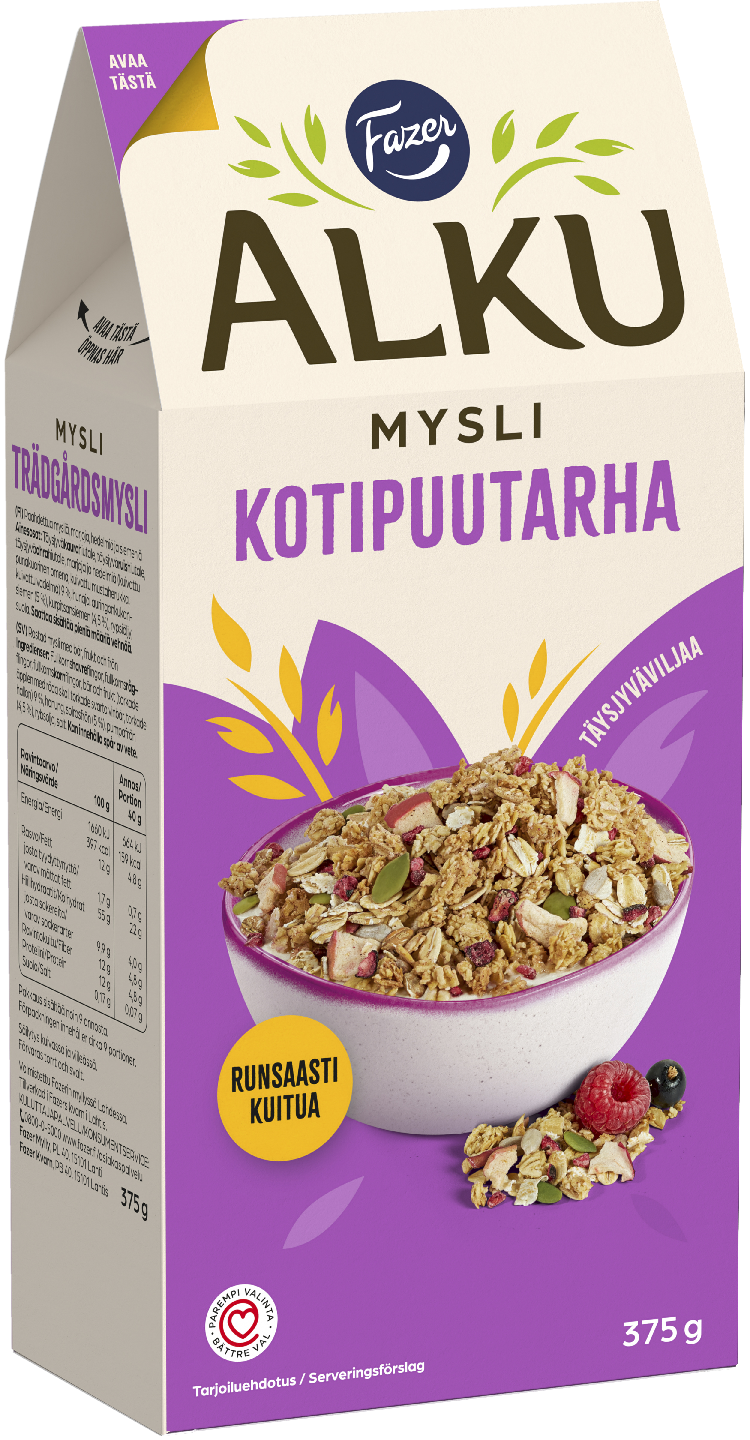 RunsaskuituinenRaikkaassa ja runsaassa Kotipuutarhamyslissä maistuu herkullisesti marjat, hedelmät, siemenet, täysjyvähiutaleet sekä paahdettu kauragranola. Mysli on runsaskuituinen, sisältää runsaasti täysjyvää ja sille on myönnetty Sydänmerkki. Tämä täysjyvämysli on valmistettu suomalaisesta viljasta Fazerin omassa myllyssä Lahdessa. Pakkauksessa on kätevä kaatonokka. Fazer Alku mysli tai granola on alku hyviin hetkiin!