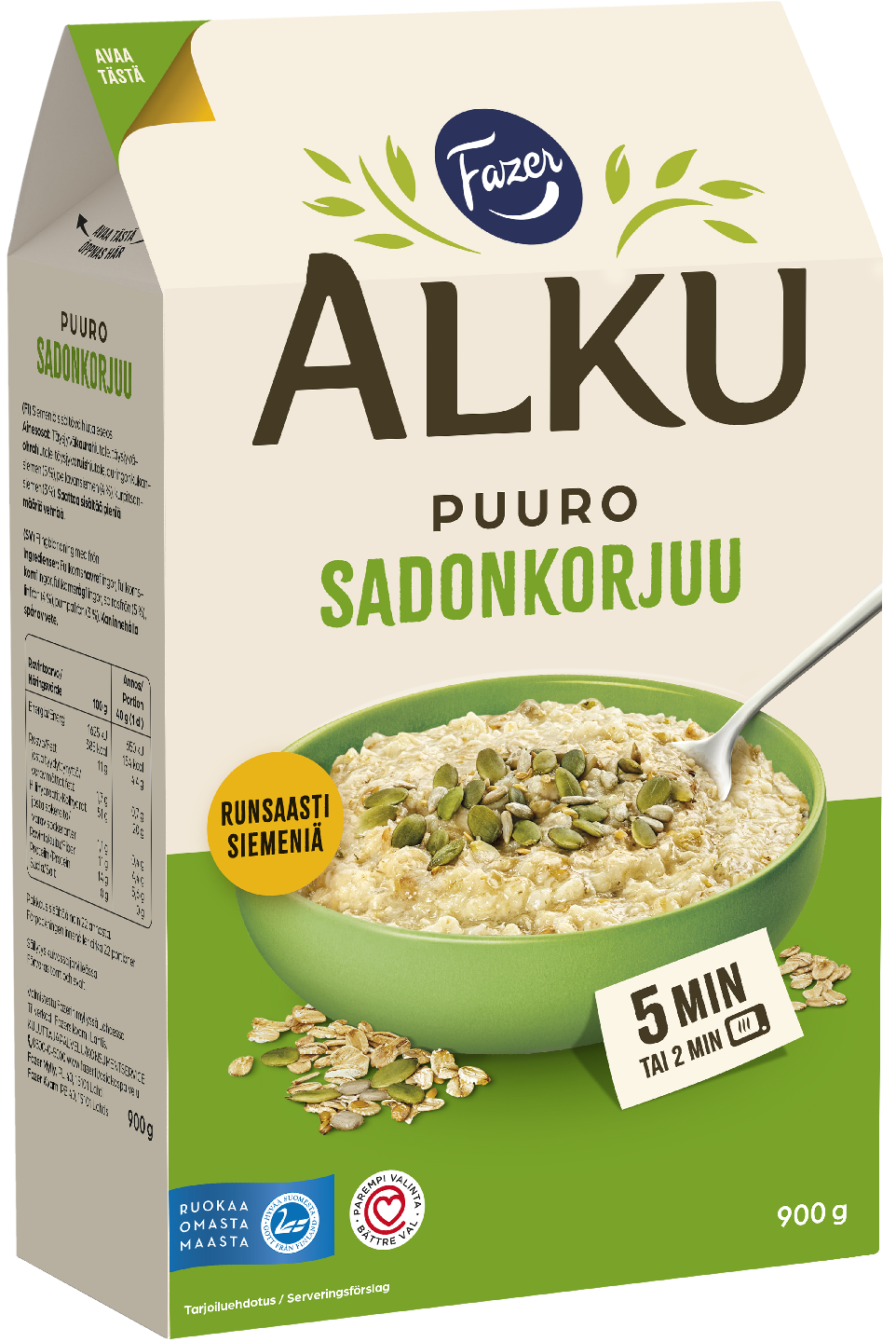 VegaaninenRunsaskuituisessa Sadonkorjuupuurossa yhdistyvät maukkaat täysjyvähiutaleet sekä rouheat kurpitsan-, auringonkukan- ja pellavansiemenet. Tuotteesta valmistuu herkullinen puuro vain 5 minuuttia keittämällä tai 2 minuutissa mikrossa. Valmistettu suomalaisesta viljasta Fazerin myllyssä Lahdessa. Alku hyviin hetkiin!