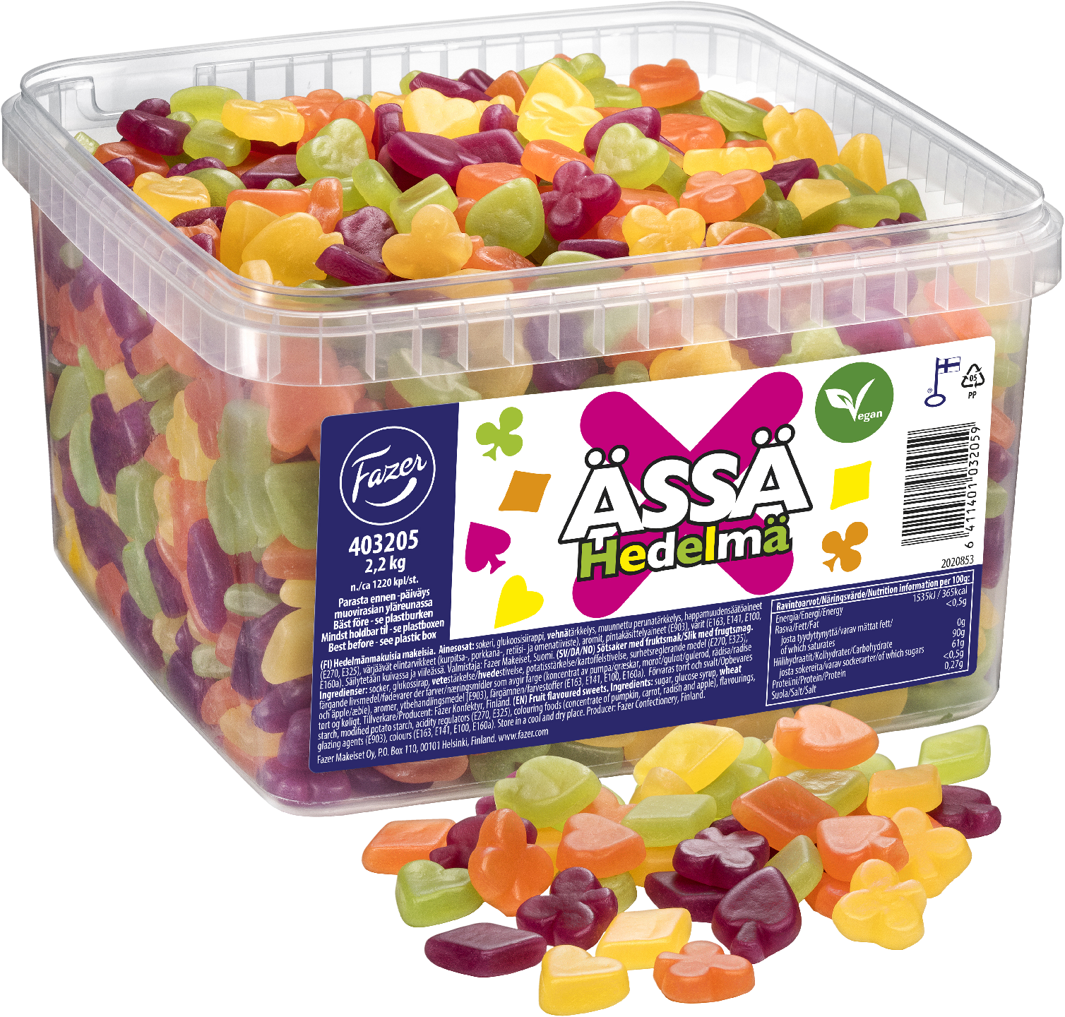 VegaaninenÄssä Mix vai Missä X? Suomalaisten kestosuosikki Ässä yhdistää parhaimmat hedelmämaut ja tutun Ässä-salmiakkilakritsin. Karkkien ehdoton ässä, Ässä Hedelmä, maistuu niin perheen pienille kuin suurille sokerisuille. Nauti yksi maku kerrallaan tai yhdistele eri makuja. Mikä on sinun suosikkisi? Laatikko sisältää n. 1220 makeista. Vegaaninen.