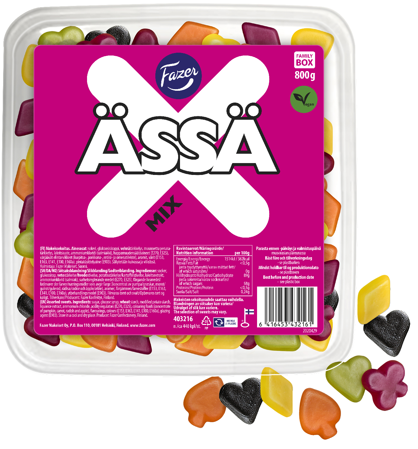 VegaaninenÄssä Mix vai Missä X? Suomalaisten kestosuosikki Ässä yhdistää parhaimmat hedelmämaut ja tutun Ässä-salmiakkilakritsin. Löydä suosikkiyhdistelmäsi – Ässä Mixin ananas-persikka-, päärynä-, appelsiini- ja mustaherukka-maut hurmaavat niin yksin kuin yhdessä salmiakin kanssa. Ässä-perheen esikoisen pelisilmä sopii tilanteeseen kuin tilanteeseen, nautittuna yksin tai jaettuna kavereiden kanssa. Sopii vegaanille.
